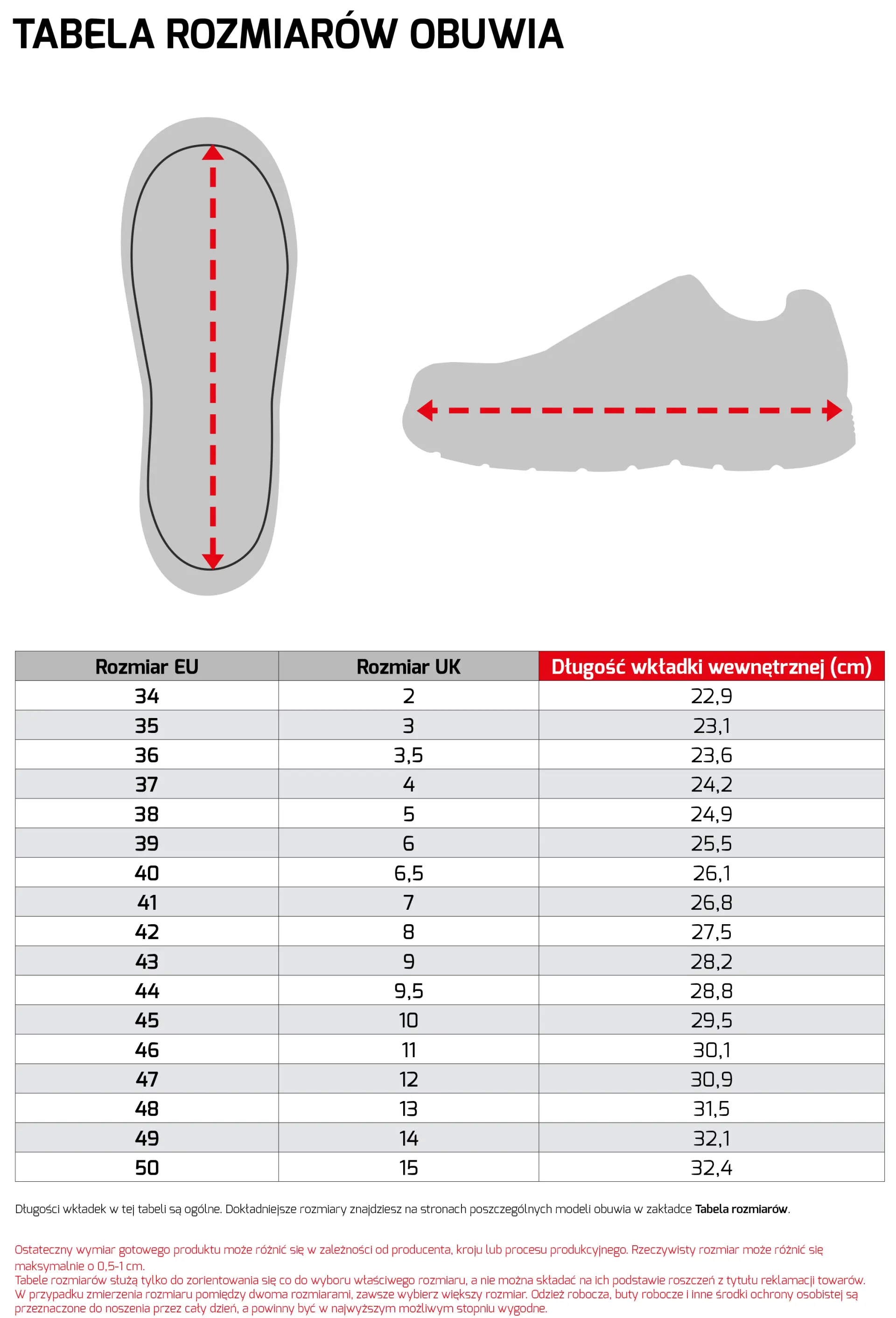Tabela rozmiarów obuwia